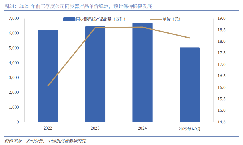 公司是国内同步器市场龙头,市占率超30%,重卡AMT有望贡献业务增量,推动同步器业务稳健发展。公司是国内同步器市场龙头,具备同步器齿环(铜质同步环、冲压钢环、精锻钢环)、齿毂、齿套、结合齿、同步器总成等全产业链制造能力,能够实现从设计、模具到成品的自主可控,公司同步器产品国内市占率超30%,同时公司发力重卡AMT相关项目,为采埃孚重卡AMT项目独家配套行星结构等零部件,部分产品直接出口德国采埃孚,并配套欧洲奔驰、达夫、曼恩、斯堪尼亚等整车厂。展望公司同步器业务未来发展,乘用车市场上,一方面公司位居龙头,有望凭借全产业链优势进一步提升市场份额,另一方面,插混车型多挡DHT系统也需用到同步器产品,如哈弗H6 DHT、吉利银河L7、奇瑞瑶光C-DM等,能够在一定程度上对冲燃油车销量下滑带来的同步器需求降低;商用车市场上,当前我国商用车自动挡渗透率较低,公司重卡AMT产品市场潜力大,有望贡献业务增量。2025年前三季度公司同步器产品单价为18.15元,在汽车市场竞争加剧、上游零部件降价压力加大的背景下保持相对稳定,预计公司同步器业务有望继续保持稳健发展。