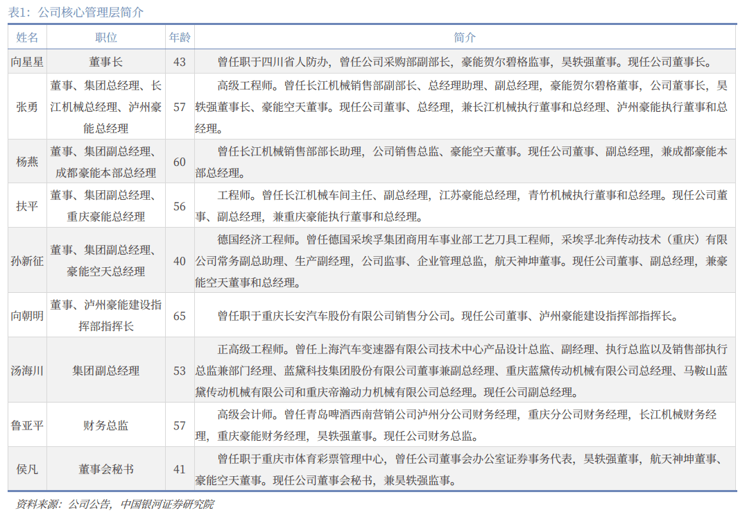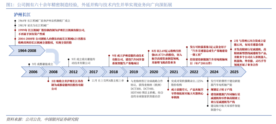 公司拥有六十余年精密制造经验,外延并购与技术内生并举实现业务向广向深拓展。公司成立于2006年,2004-2008年,公司创始人向朝东实现对拥有四十余年发展历史的泸州长江的全资控股,2008年公司吸收合并泸州长江并改制为股份公司,切入汽车同步器领域,并逐步实现从同步环、结合齿向齿毂、齿套等产品的拓展,成长为具备同步器总成生产能力的厂商。2017年上市以来,公司通过外延并购与技术内生并举实现业务向广向深拓展,外延并购方面,2020年-2021年先后完成昊轶强收购与成立豪能空天,切入航空航天零部件制造领域,技术内生方面,基于自身在同步器积累的精密制造技术经验,产品由同步器向差速器、电机轴、定转子、新能源汽车同轴行星减速器等驱动系统部件拓展,并基于产品特性实现向机器人领域行星减速器、摆线减速器等产品的拓展,为公司成长带来多维动能。