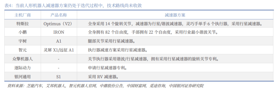 当前人形机器人减速器方案仍处于迭代过程中,技术路线尚未收敛。当前人形机器人产品仍处于技术路线迭代与场景探索阶段,尚未实现大规模量产,由于不同类型的减速器的优劣势不同,适用场景不同,当前人形机器人减速器方案同样处于迭代过程中,头部企业特斯拉、小鹏、宇树、智元、银河通用等采用行星、谐波、RV等差异化解决方案,技术路线尚未收敛。人形机器人在手臂、灵巧手部、腰部、腿部等关节处均需要执行器,各部位对空间、负载能力、精度等指标要求不同,预计各类减速器能够凭借自身差异化优劣势应用于不同类型关节或应用场景,各类减速器均有一定的市场规模扩容前景。