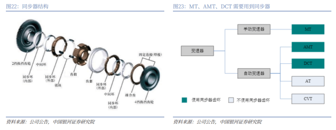 同步器用于实现平稳换挡,主要应用于MT、AMT、DCT等变速器中。同步器安装在变速箱内,作用是在换挡时将即将要啮合的齿轮转速达到一致实现顺利啮合,从而让汽车更加平稳的运行。按照操纵方式分类,可以将汽车变速器分为手动变速器和自动变速器,其中自动变速器可分为AMT(由普通齿轮式机械变速器增加电子控制系统组成的机械自动变速器)、DCT(双离合器自动变速器)、AT(液力自动变速器)、CVT(机械无极自动变速器),MT(手动变速器)、AMT和DCT需要用到同步器,据华经产业研究院数据,2023年我国乘用车变速器搭载量为2386万台,其中MT&AMT变速器搭载量为156.2万台,占比6.5%,DCT变速器搭载量为563万台,占比23.6%,同步器具备较稳定的市场空间。