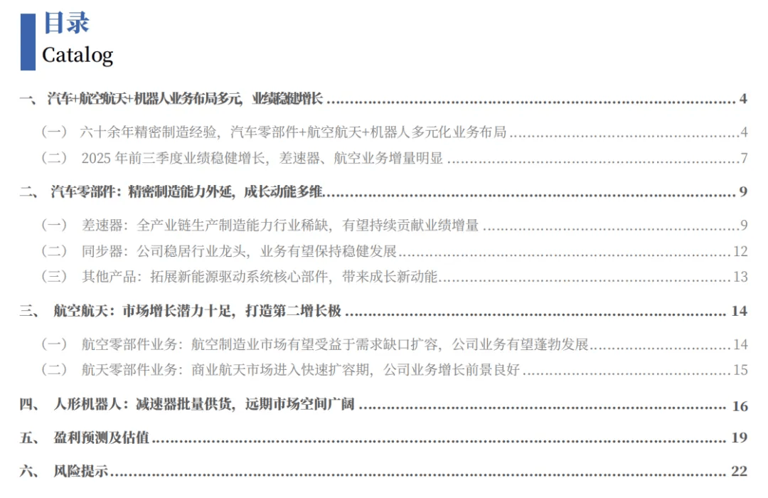 公司现有汽车零部件、航空航天、机器人三大业务条线,具备多维成长动能。汽车零部件业务上,公司布局有同步器、差速器、电机轴、定转子等产品,公司以同步器业务起家,通过拓展差速器、电机轴、定转子等产品有效对冲了燃油车销量下滑带来的同步器产品收入下滑风险,依托我国汽车产业新能源转型趋势延续汽车零部件业务成长动能;航空航天业务上,公司布局有火箭阀门、结构件、钣金件、管路等产品,我国将航空航天作为战略性产业,当前在民机、火箭上存在较大的需求缺口,公司业务前景广阔;机器人业务上,公司基于自身精密制造能力布局行星减速器、摆线针轮减速器等产品,机器人产业长坡厚雪,减速器作为机器人核心部件市场规模扩张潜力十足。