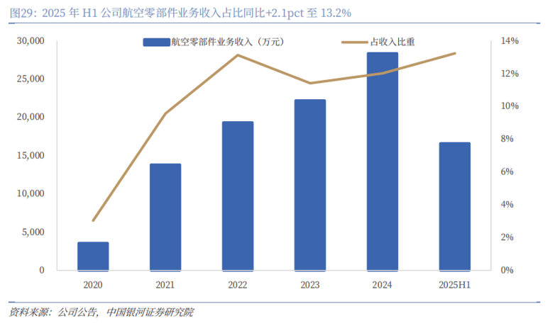 航空航天:市场增长潜力十足,打造第二增长极:公司通过收购昊铁强、成立豪能空天等切入航空航天业务,有望受益于航空航天市场规模的持续扩容。航空业务方面,当前我国民机市场存在较大的需求缺口,叠加国产化的持续推进,国内市场扩容前景良好,公司位于成德绵自凉航空航天集群,区位配套优势明显,2025年H1公司航空零部件业务收入同比+31.7%至1.7亿元,占总收入比重同比+2.1pct至13.2%,有望继续作为重要动能驱动公司业绩增长;航天业务方面,中美引领太空算力“军备竞赛”,商业航天市场进入快速扩容期,公司主要提供火箭的阀门和钣金等产品,可配套价值量约占单发火箭价值量的10%-20%,按照单发火箭5000万元-1亿元的价值量计算,公司单发火箭可配套价值量为500-2000万元,业务增长前景广阔。