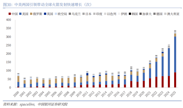 低轨卫星频段具有稀缺性,中美引领太空算力“军备竞赛”,商业航天市场有望进入快速扩容期。低轨卫星兼具带宽和低延时优势,是构建卫星互联网的重要组成部分,根据国际电信联盟《无线电规则》规定,任何卫星通信系统都需要向国际电信联盟申报相应频段的卫星网络资料,按照“先占先得”原则规范全球范围内空间资源的有序使用,因此低轨卫星频段具有排他性和稀缺性。伴随太空数据中心的低延迟、能源消耗等优势体现,AI智算卫星成为卫星产业重要发展趋势,在中美两国带动下,卫星发射进入快速增长阶段,据spacelive数据,2025年中美两国分别发射火箭90/211次,占全球火箭发射次数的26.5%/62.2%,带动全球火箭发射同比增长32.9%,据中国科学院网站刊登,地球近地轨道可容纳约6万颗卫星,到2029年该轨道将部署总计约5.7万颗低轨卫星,太空算力部署“军备竞赛”有望带动商业航天市场进入快速扩容期。