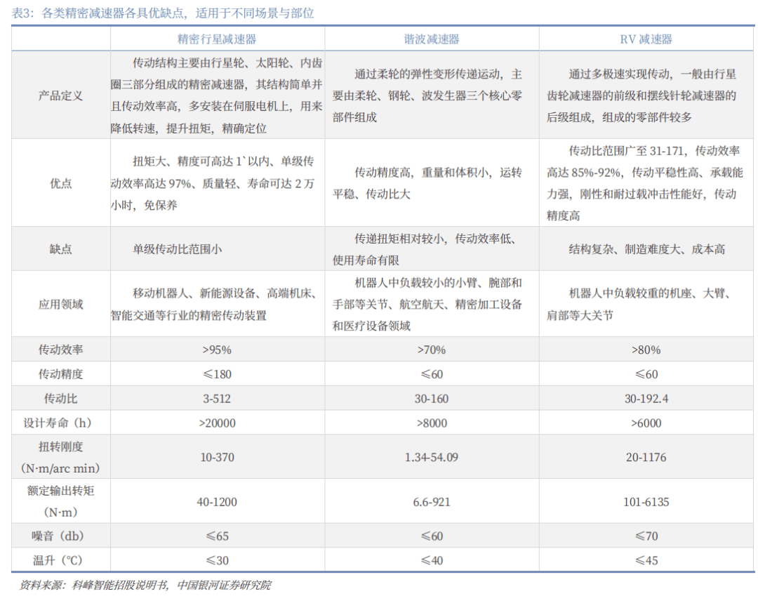 精密减速器是人形机器人旋转关节核心部件,各类减速器各具优缺点,适用于不同场景与部位。人形机器人关节主要为旋转执行器和线性执行器,其中旋转执行器输出旋转运动,线性执行器将旋转运动转换为直线运动输出,旋转执行器主要由减速器、电机、力传感器、轴承等组成,据觅途咨询数据,减速器价值量约占人形机器人整机的13%,仅次于丝杠和无框力矩电机,是人形机器人的核心部件。按照应用领域分类,减速器可分为通用减速器、专用减速器和精密减速器,其中精密减速器具备精度高、体积小、稳定性强、寿命长的特点,广泛应用于机器人、数控机床等高端制造领域,精密减速器按照技术原理不同可分为精密行星减速器、谐波减速器和RV减速器,三种产品各具差异化优缺点,其中精密行星减速器传动效率高、寿命长、结构简单、成本较低,但单级传动比小,不适用于较高负载场景,已在四足机器人、小型机器人上有所应用;谐波减速器传动精度高、体积小,但传动效率低,使用寿命低,通常用于机器人负载较小的小臂、腕部和手部等关节;RV减速器传动比高、传动效率高,传动精度高,但结构复杂、体积大且成本较高,通常用于机器人中负载较重的机座、大臂、肩部等关节。