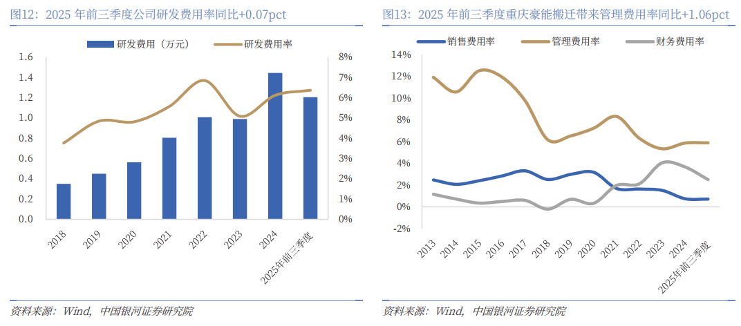 期间费用率较为稳定,重庆豪能搬迁带来一次性费用增长。2025年前三季度公司研发费用为1.21亿元,同比+13.4%,研发费用率同比+0.07pct至6.37%,较为稳定。2025年前三季度公司销售/管理/财务费用率分别为0.72%/5.90%/2.51%,同比分别-0.01pct/+1.06pct/-1.51pct,管理费用率的上涨主要是由于重庆豪能搬迁带来的一次性费用,财务费用率下降受益于利息费用的降低。