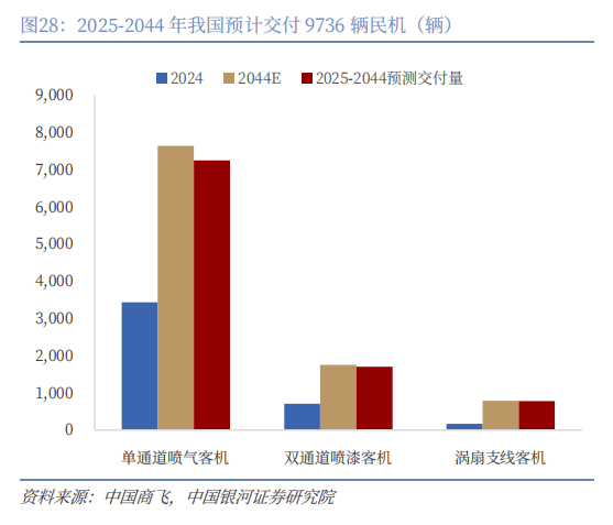 当前我国在民机上存在较大的需求缺口,我国航空制造业市场有望持续扩容。据中国商飞预测,受益于我国经济的稳健增长以及商贸、旅游业的持续蓬勃发展,预计到2044年,中国(含港澳台)客机机队规模有望达到10175辆,其中单通道喷气客机7639辆、双通道喷气客机1750辆,涡扇支线辆,考虑到现有客机的退役,预计2025-2044年我国客机交付量为9736辆,其中单通道喷气客机7250辆、双通道喷气客机1703辆,涡扇支线辆,当前我国民机制造国产化持续推进,C919订单已超千辆,国产化率达到60%,有望推动我国民机制造业市场持续扩容。
