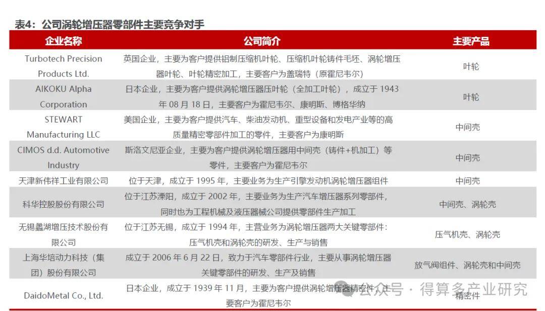 叶轮竞争对手以海外厂商为主,中间壳竞争对手包括海外+国内厂商。公司生产的涡轮增压器零部件主要是叶轮、中间壳等,两者均为涡轮增压器的主要零部件,是保证涡轮增压器的动力性能、经济性能、可靠性及耐久性的重要零件。叶轮、中间壳等涡轮增压器的零部件工作时长期处于高温、有害废尾气的腐蚀,其工作环境十分恶劣,对零部件材料抗疲劳抗冲击的物理性能和耐腐蚀的表面化学性能要求很高。叶轮方面,公司竞争对手主要是Turbotech Precision Products、AIKOKU Alpha Corporation等海外厂商;中间轮方面,除STEWART Manufacturing、CIMOS d.d. Automotive等海外厂商外,公司竞争对手还包括新伟祥、科华控股、蠡湖股份、华培动力等国内厂商。